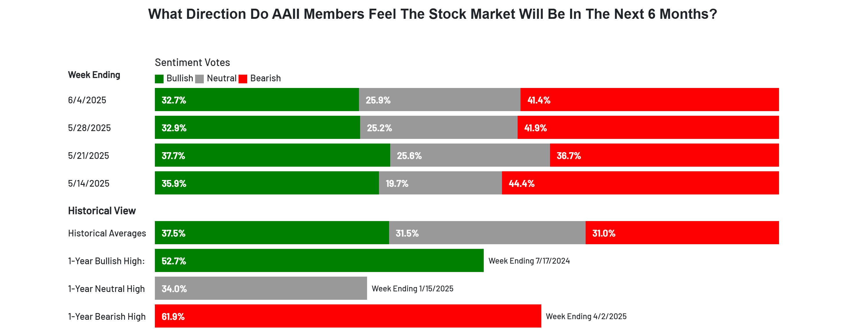Neutral sentiment, expectations that stock prices will stay essentially unchanged over the next six months, increased 0.7 percentage points to 25.9%. Neutral sentiment is below its historical average of 31.5% for the 46th time in 48 weeks.