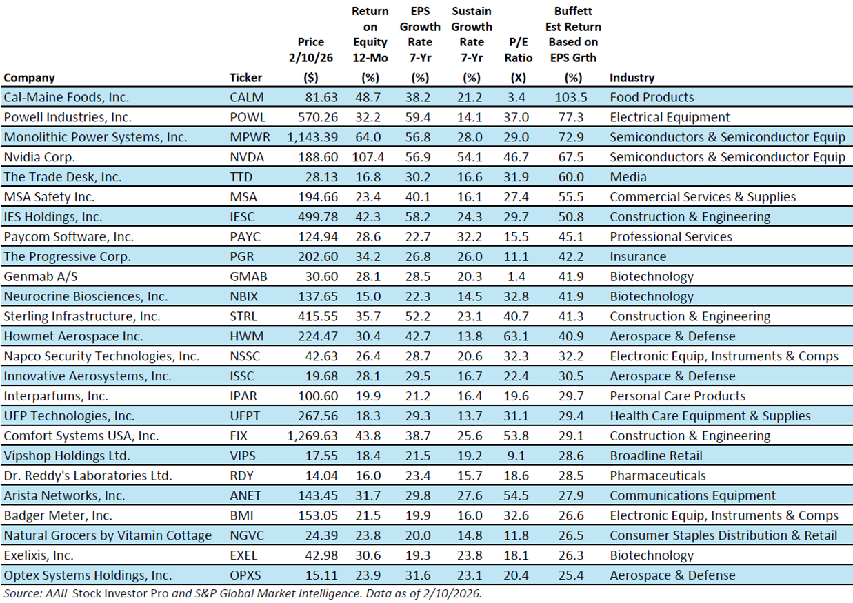 AAII built a stock screen based on Buffett’s strategy that focuses on strong historical growth in earnings per share. As of January 30, AAII’s Buffettology EPS Growth screen has an average annual gain of 12.4% since inception in 1998, compared to the S&P 500 index’s return of 7.3% over the same period.