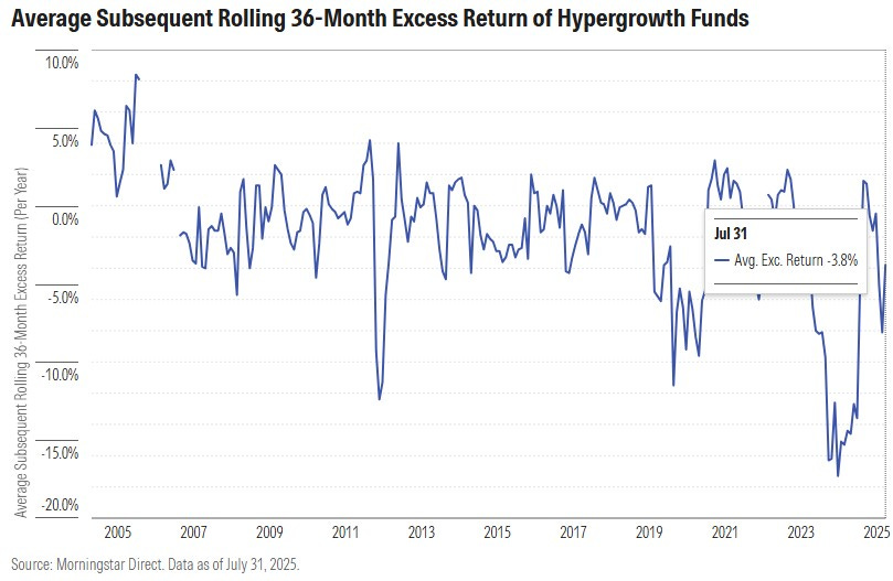 Morningstar’s Jeffrey Ptak, CFA, looked at hyper-inflow funds. These are ETFs and mutual funds with 12-month increases in net inflows of at least 200% relative to net assets. (Net inflows are dollars invested into a fund less dollars withdrawn.) He limited the universe to funds with a minimum starting net asset value (NAV) of at least $500 million. As such, all 568 of the identified funds had at least $1 billion in net inflows. The study period was August 1, 1998, through July 31, 2025.