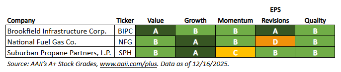 Using AAII’s A+ Stock Grades, the following table summarizes the attractiveness of three gas utility stocks—Brookfield Infrastructure, National Fuel Gas and Suburban Propane Partners—based on their fundamentals.