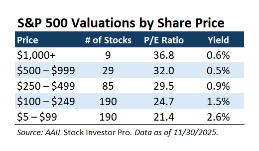 When we separate the S&P 500 member companies into share price buckets, we do see the impact of investor enthusiasm on valuations. Stocks whose share prices are at least $1,000 or between $500 and $999 have median price-earnings (P/E) ratios above 30.0. Stocks whose share prices are below $100 have a median price-earnings ratio of 21.4.