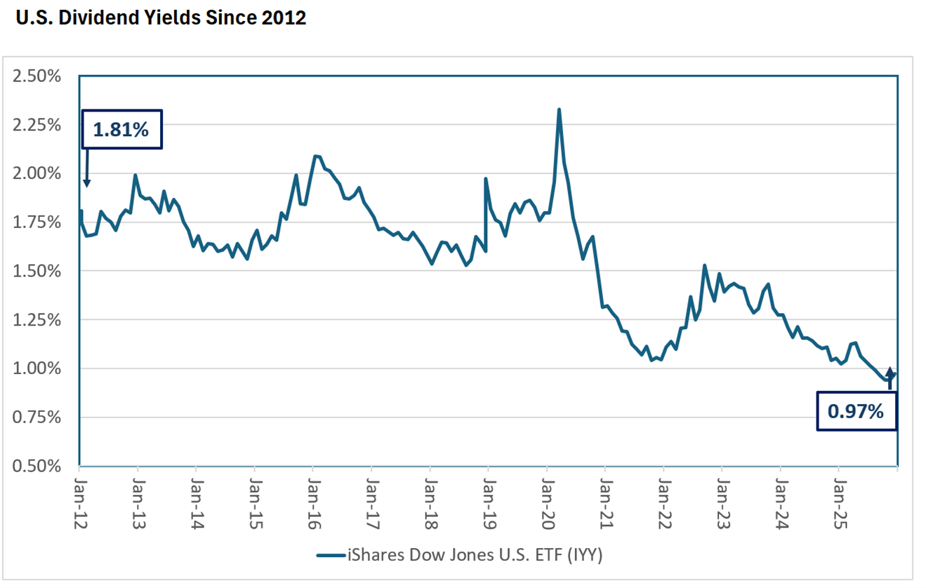The stock market’s dividend yield has fallen below 1%. The large influence of technology-related stocks on the market is a major contributing factor. Share buybacks are also playing a role, though companies continue to grow their dividends.