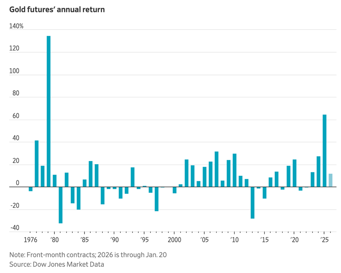 “In five of the six years before 2025 that gold futures rose by at least 20%, they climbed again the following year. And in those five years, the average increase was more than 15%,” reported The Wall Street Journal yesterday. The newspaper credited Citi analysts for the data.