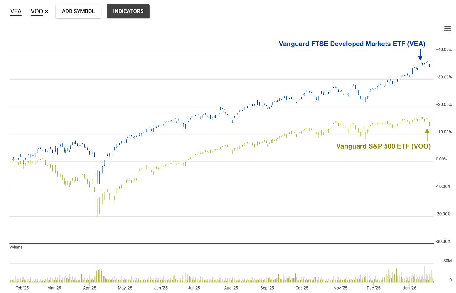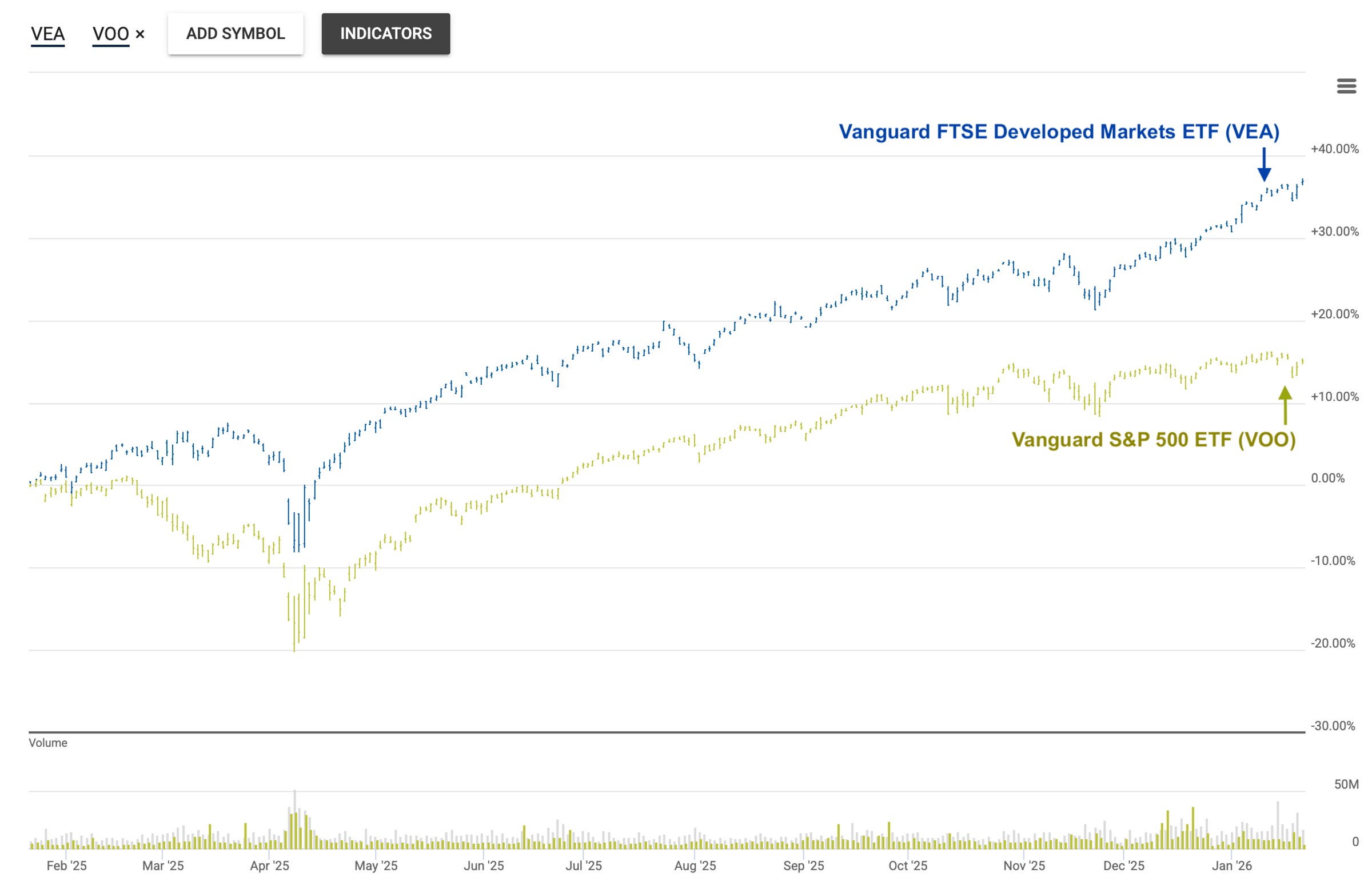 Since the chart below doesn’t start on January 1, 2025, I’ll share the return figures. The Vanguard FTSE Developed Markets ETF (VEA) jumped by 35.1% last year. The domestic Vanguard S&P 500 ETF trailed with a still good 17.8% return.