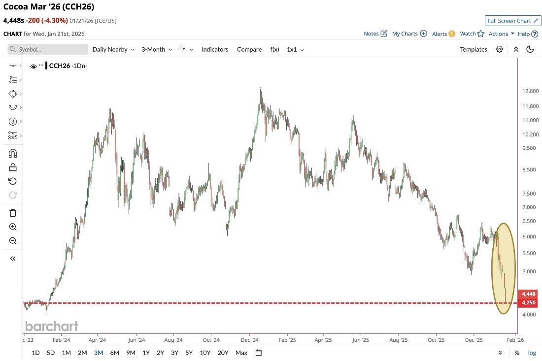 Chocolate lovers, rejoice! Cocoa prices hit a two-year low yesterday. Barchart cited two primary reasons for this. First, demand is “tepid,” with both European and Asian cocoa grindings down. (Grindings are a measure of how much cocoa is being processed.) Second, inventories are expected to rise thanks to improving conditions in key cocoa-producing West African countries.