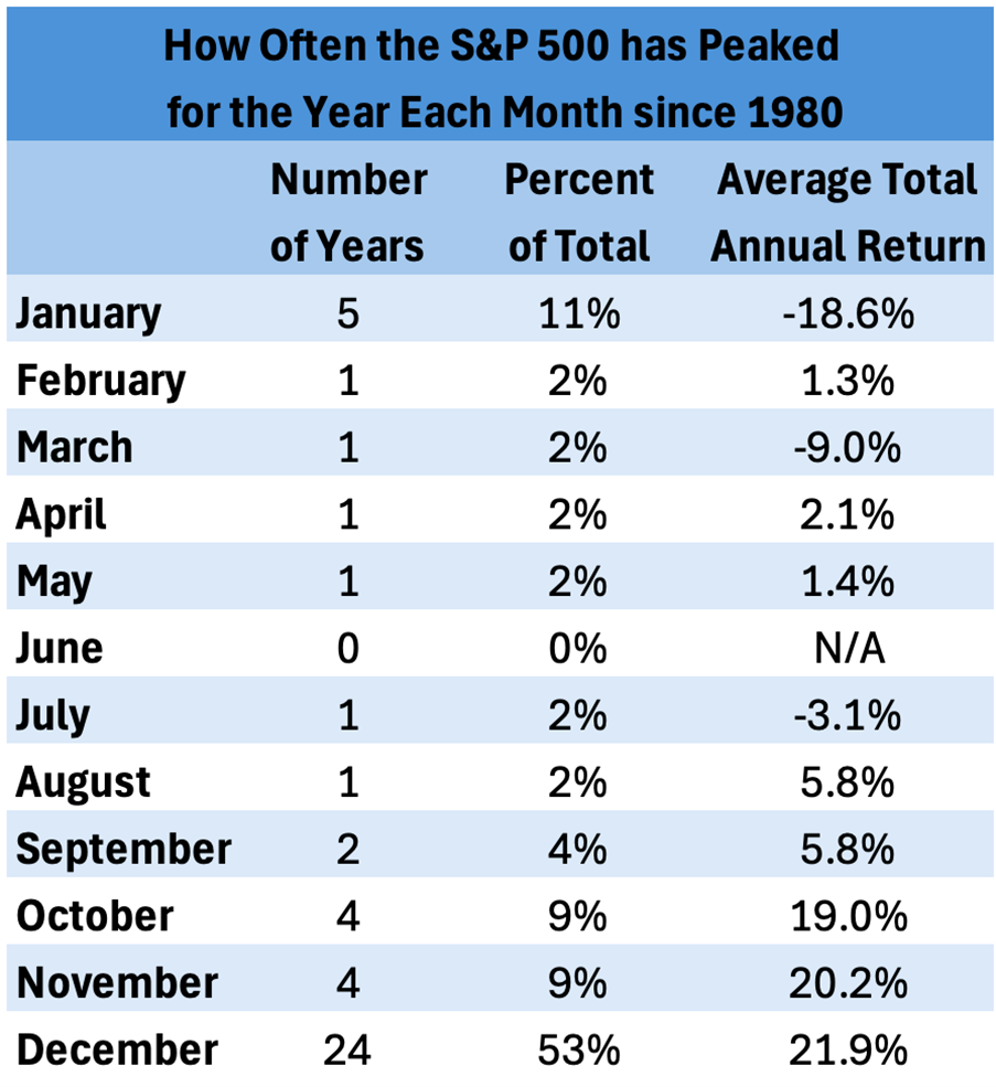 December has done more than bring gifts to the good boys and girls; it has also tended to grow investors’ wealth. According to DataTrek, the S&P 500 index “has peaked for the year in December over half the time back to 1980 (53%, 24 out of 45 years). The average annual return during the years when the S&P 500 peaked in December was 21.9%.”