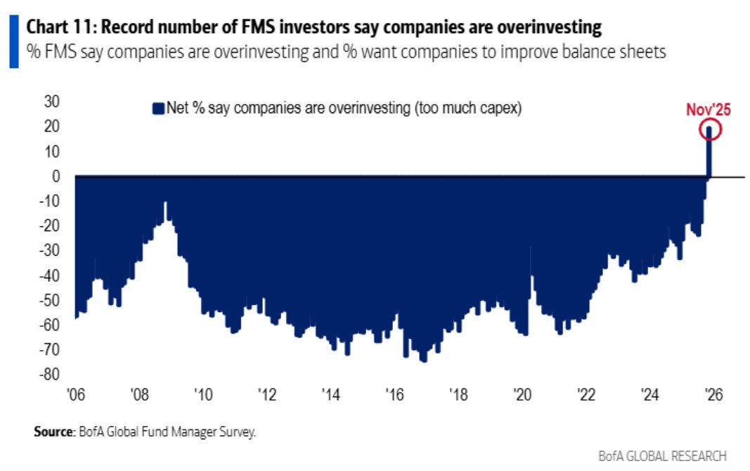 This borrowing binge hasn’t gone unnoticed. A recent BofA Global Research chart tweeted by Barchart shows a net positive amount of fund managers saying that technology companies are overinvesting.