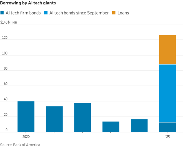Artificial intelligence (AI) does not come cheap, and the largest technology companies have been turning to the bond markets to help finance it. The Wall Street Journal’s Jason Zweig noted in his Intelligent Investor column that “between September 1 and November 13—less than three months—big tech companies issued more bonds than they had in the previous three calendar years combined.”