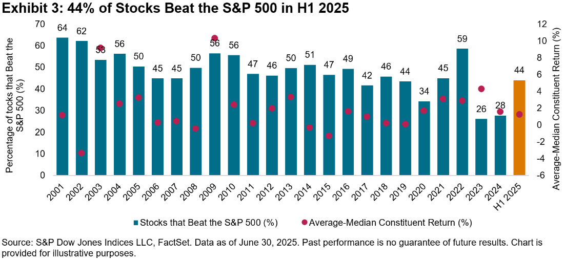 Just 44% of the S&P 500’s member stocks outperformed the index during the first half of 2025. This below-average level has made it harder for large-cap stock-pickers to outperform. It also explains why strategies that don’t target the so-called Magnificent Seven technology stocks are underperforming.