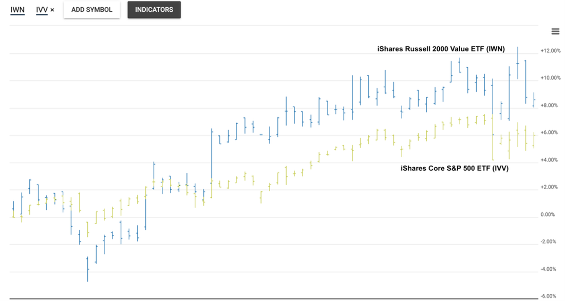 Over the past three months, the iShares Russell 2000 Value ETF (IWN) has outperformed the iShares Core S&P 500 ETF (IVV). Three months is not enough time to declare a shift in trends, but small-cap value remains historically undervalued relative to large-cap stocks.