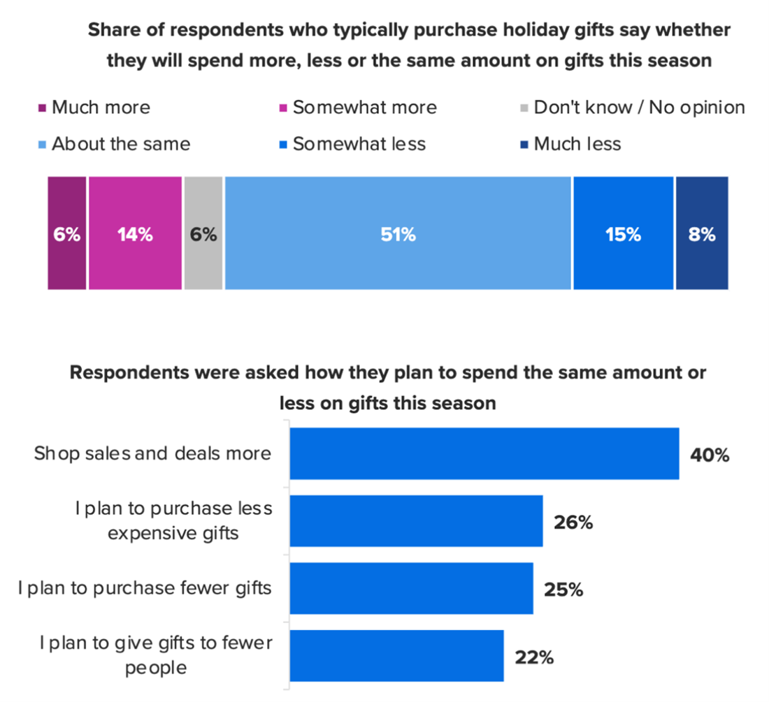 “Most shoppers who typically buy holiday gifts (74%) said they plan to spend the same as they usually do, or less, this year,” a Morning Consult survey found. “Those who said they’re spending more are planning to buy more gifts (42%) and say they will give gifts to more people (35%), so their per-gift costs aren’t necessarily increasing as much as the size of their overall shopping list.”
