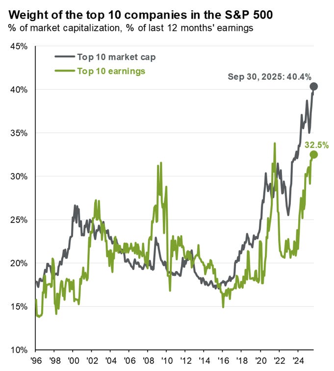 Just 10 of the 500 companies within the S&P 500 account for 40.4% of the index’s market capitalization. This is an extremely high number.