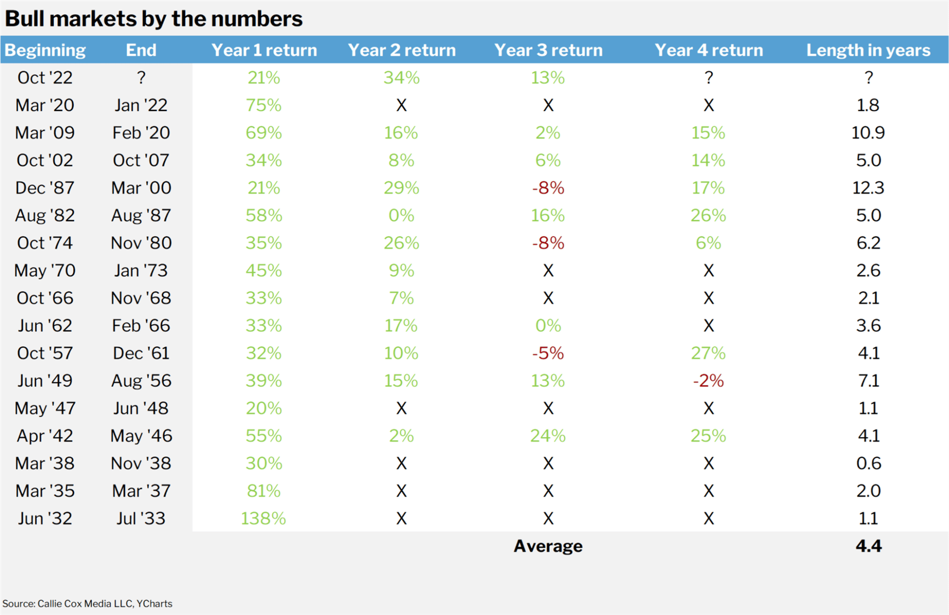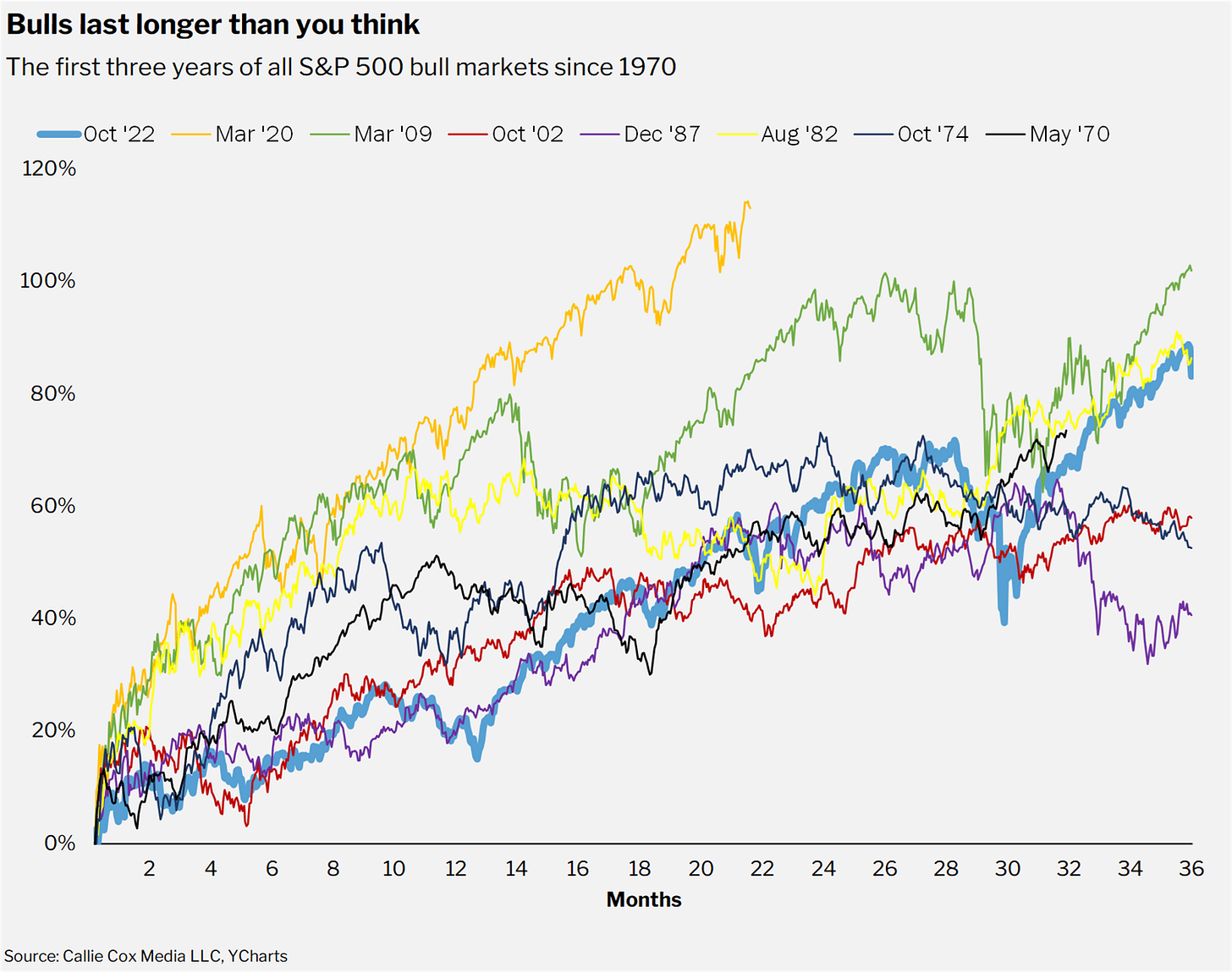 The S&P 500 index’s 87% gain since October 2022 is above average relative to all bull markets since 1970. However, it is hardly top tier, as this chart from Callie Cox shows.