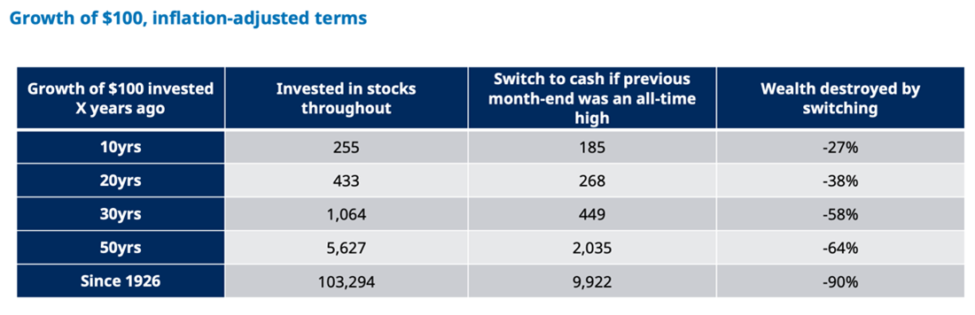 This table from Schroders illustrates the advantage of staying invested when the market is trading at an all-time high. The footnote accompanying the table said, “Data January 1926–December 2024. Switching strategy moves into cash for the next month whenever the previous month-end was an all-time high and is invested in stocks whenever it wasn’t.”