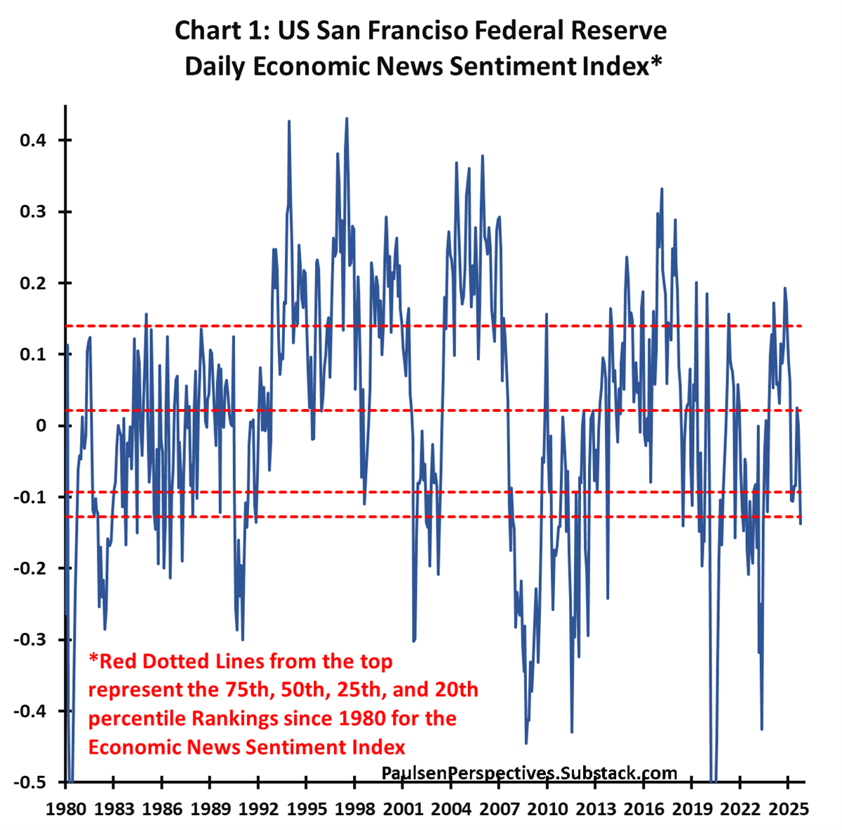 A high frequency measure of economic sentiment—the San Francisco Federal Reserve’s Daily News Sentiment Index (DNSI)—is currently lower than 81% of all readings since 1980. “When pessimism about the economy gets as sour as it is today, usually the stock market has performed remarkably well,” wrote retired market strategist Jim Paulsen on his Substack.