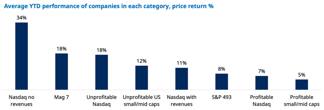 One more chart from Schroders. Nasdaq composite companies with no revenues have realized the highest year-to-date price returns through September 30, 2025. Ranking in third and fourth place were unprofitable companies.