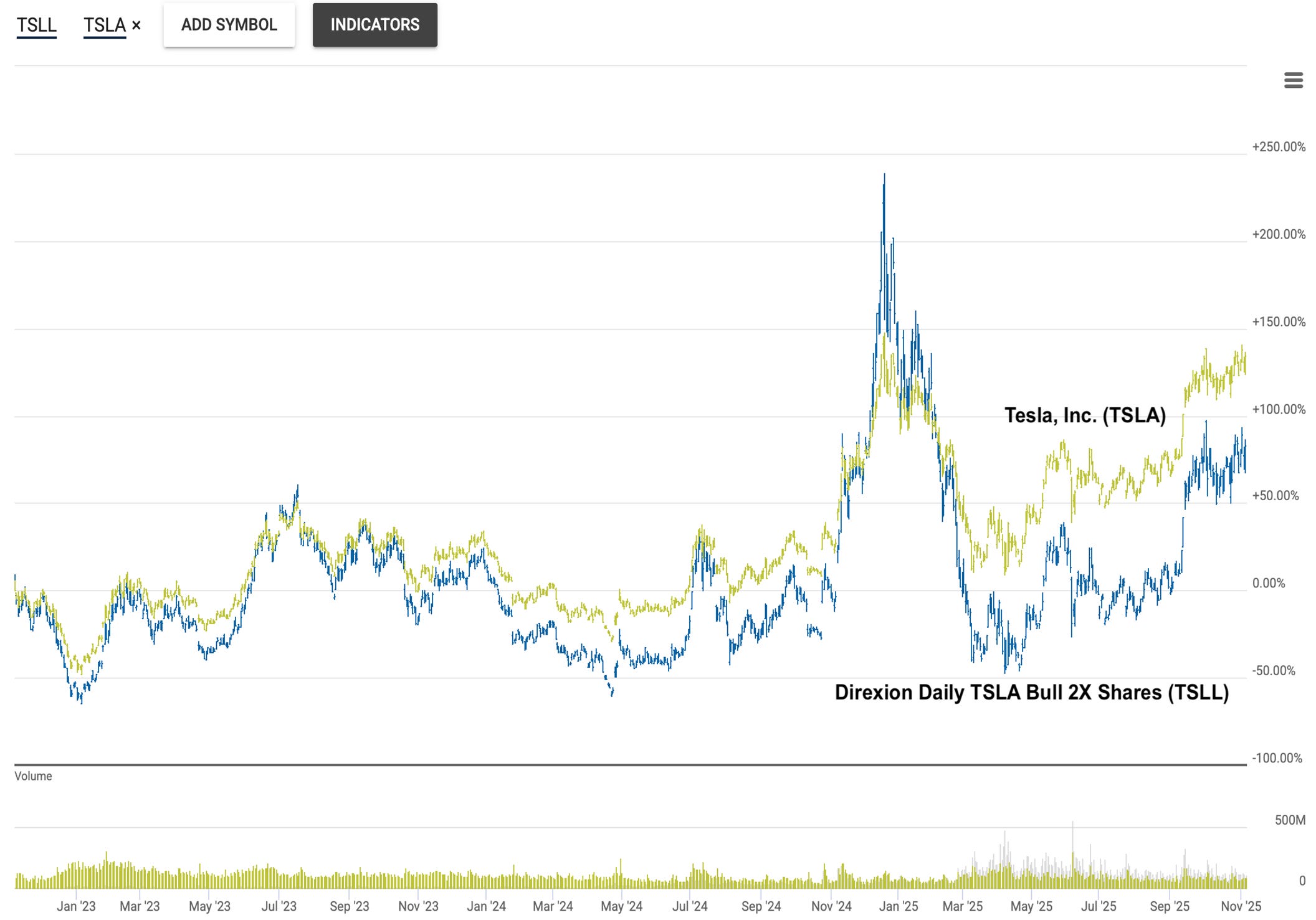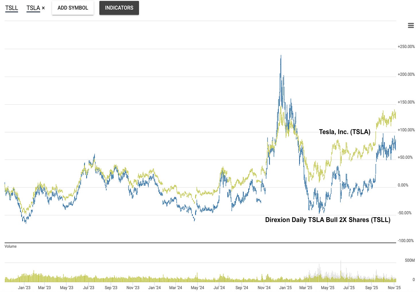 Three-Year Performance of TSLL and TSLA