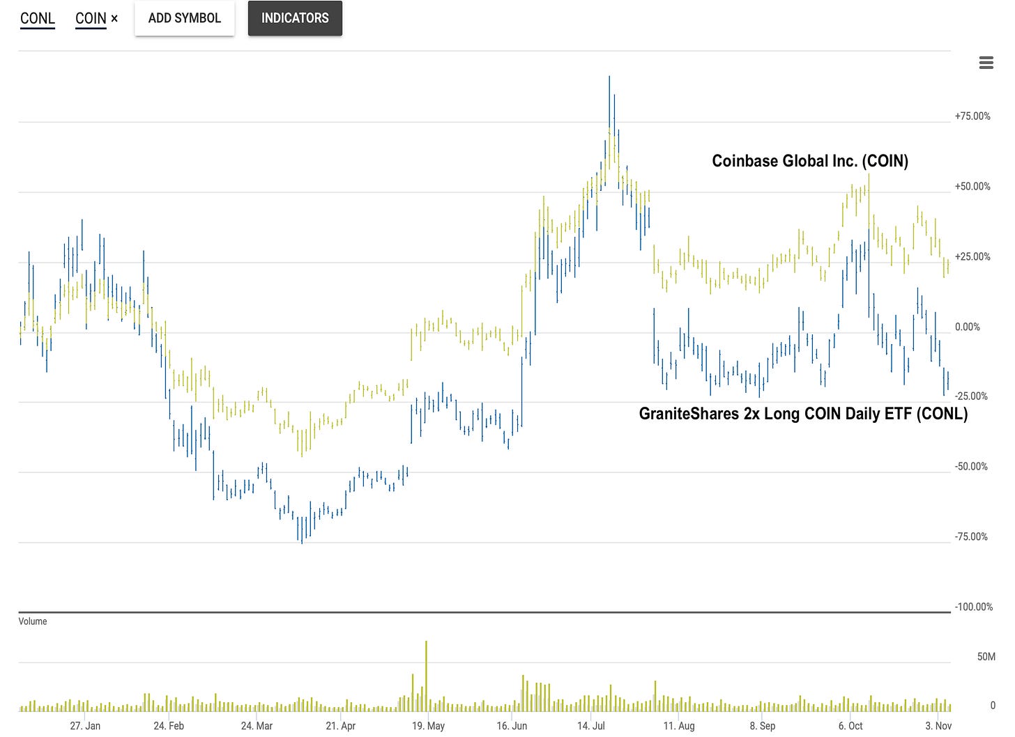 Year to date through the close on Wednesday, November 5, 2025, GraniteShares 2x Long COIN Daily has fallen 11%. This drop in price has occurred even though shares of Coinbase Global are up 29% this year. Ouch!