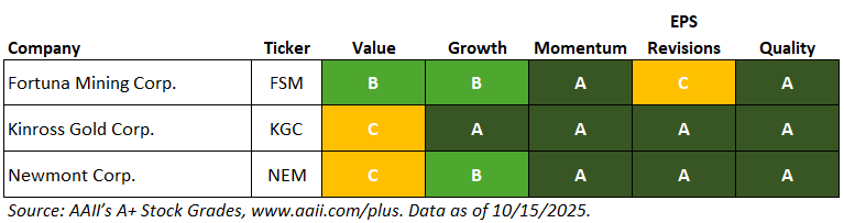 This week, we use AAII’s A+ Investor Stock Grades to provide insight into three metals and mining stocks. With gold breaking above $4,000 per ounce and demand continuing to build, should you consider the three stocks of Fortuna Mining Corp. (FSM), Kinross Gold Corp. (KGC) and Newmont Corp. (NEM)?