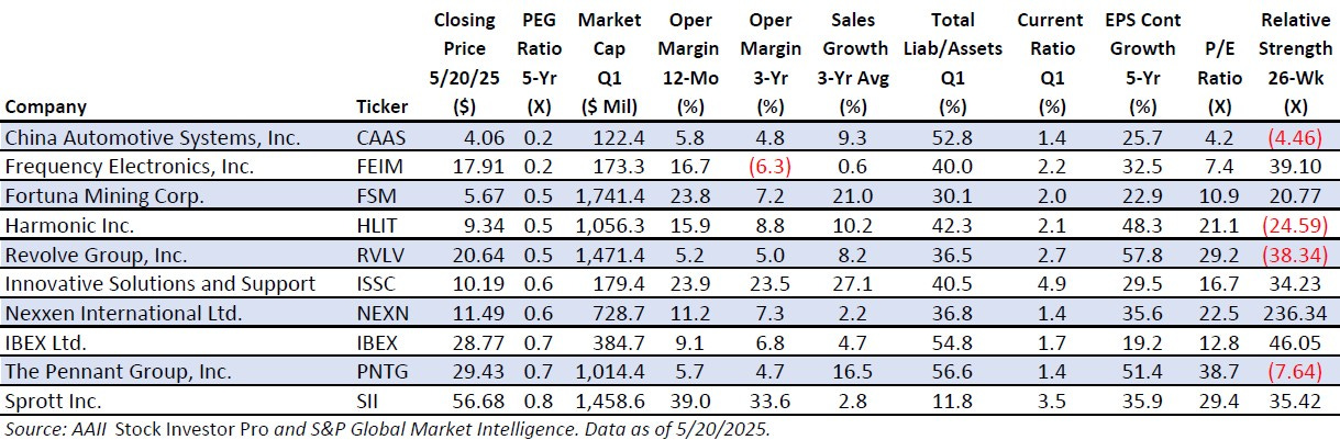 The Wanger strategy focuses on limiting the risk of investing in small-cap stocks by using value, size and growth filters to find small-cap companies that exhibit long-term growth characteristics. Wanger outlined his strategy in his book “A Zebra in Lion Country: Ralph Wanger’s Investment Survival Guide” (Simon & Schuster, 1997), which was used as the basis for AAII’s interpretation of the Wagner model. As of April 30, 2025, AAII’s Wanger screen has an annual gain of 10.4% since inception in 1997, versus 7.1% for the S&P SmallCap 600 index over the same period. The Wanger screen is up 28.1% year to date, compared to a loss of 13.1% for the S&P SmallCap 600 over the same period.
